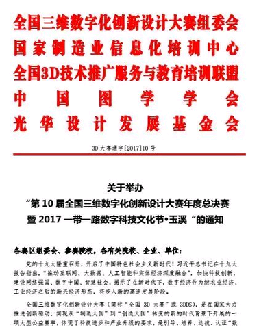 第10屆全國三維數字化創新設計大賽年度總決賽暨2017一帶一路數字科技文化節定于2017年12月6日至12月9日在云南省玉溪市盛大舉辦。“數造杯”數字化創意設計與智能制造(3D打印)大賽作為主活動之一,將于12月6日-12月9日同期舉行。現將相關活動具體安排通知如下: