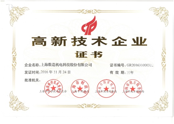 2017年2月7日,上海數造機電科技股份有限公司收到了由上海市科學技術委員會、上海市財政局、上海市國家稅務局、上海市地方稅務局聯合頒發的“高新技術企業”認定......